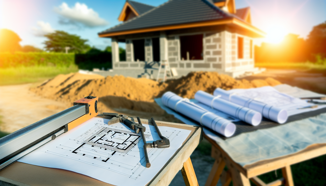 Stavenisko s rozostavaným domom, plánmi a nástrojmi na stole, so slnkom v pozadí.