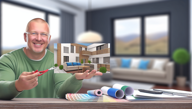 alt_text: Moderný byt v rekonštrukcii, živá atmosféra, spokojný majiteľ s dizajnovými vzorkami.