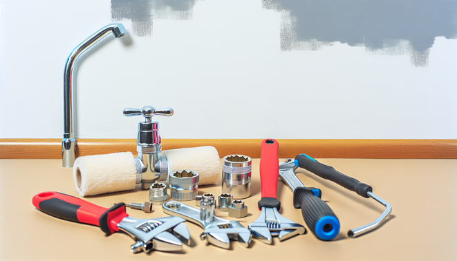 Domáca súprava na opravy na stole: kohútik, kľúče, valček, skrutkovače, zásuvky, stena s náterom.