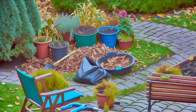 Záhrada na jeseň s mulčovanými rastlinami, zakrytými kvetináčmi a nástrojmi na lavičke.